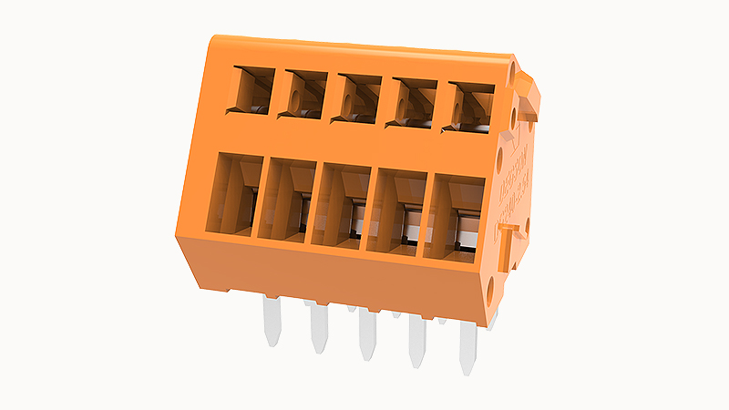 Клемма для печатной платы c шагом 2,54 мм, 5 полюсов, цвет - оранжевый, номинальное напряжение - 130 B, номинальный ток - 6 А, тип подключения - пружинный зажим, монтаж - пайка волной припоя, угол между проводником и печатной платой - 45°, сечение проводника от 0,2 до 0,5 мм², длина зачистки изоляции - 6 мм, материал контакта - медный сплав, покрытие контакта - луженый, материал корпуса - полиамид 6.6, класс воспламеняемости - V0, температура окружающей среды при эксплуатации от -40°C до +105°C