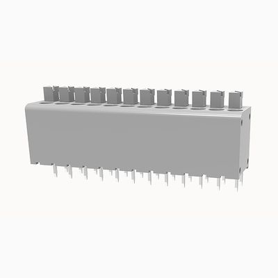 Клемма для печатной платы c шагом 3,81 мм, 12 полюсов, цвет - серый, номинальное напряжение - 200 B, номинальный ток - 10 А, тип подключения - зажим Push-in, монтаж - пайка волной припоя, угол между проводником и печатной платой - 90°, сечение проводника от 0,2 до 1,5 мм², длина зачистки изоляции - 8 мм, материал контакта - медь, покрытие контакта - луженый, материал корпуса - полиамид 6.6, класс воспламеняемости - V0, температура окружающей среды при эксплуатации от -40°C до +105°C